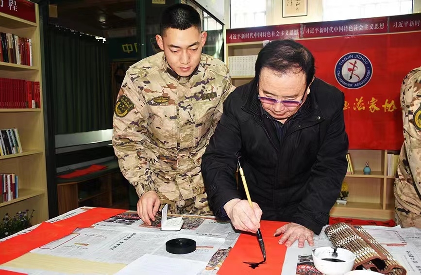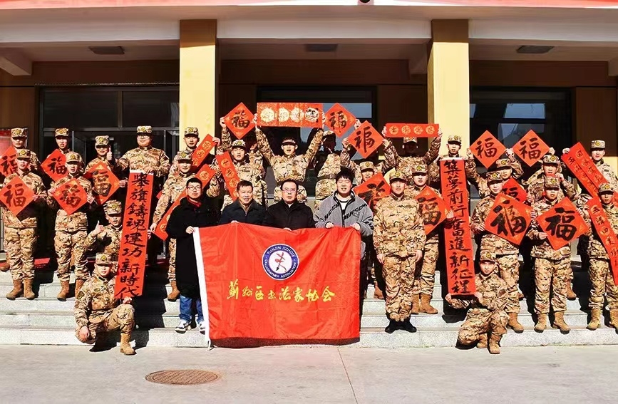 在新春佳节来临之际,1月16日上午,天津市蓟州区书法家协会的史鹏福、盛国东、魏悦亨、陈野、席进虎几位书法家怀着对军营的浓浓情意,来到武警天津总队执勤四支队某中队为官兵们献上癸卯兔年的文化盛宴和新春祝福。