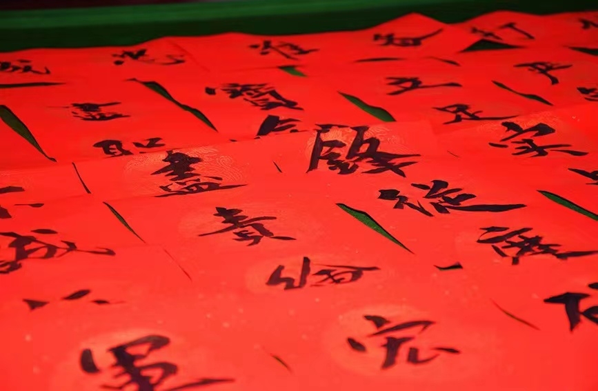寒风凛冽,依然挡不住官兵喜迎新春佳节的热情。书法家们一边挥笔弄墨精心创作,一边与官兵交流,讲解春联文化及书法技巧,官兵听得入神,大家争相提笔写下自己的祝福,互送平安。“看到这些喜庆、满满祝福的对联,一下子感觉年味越来越浓了,家就在这里。”
