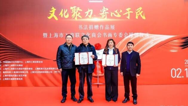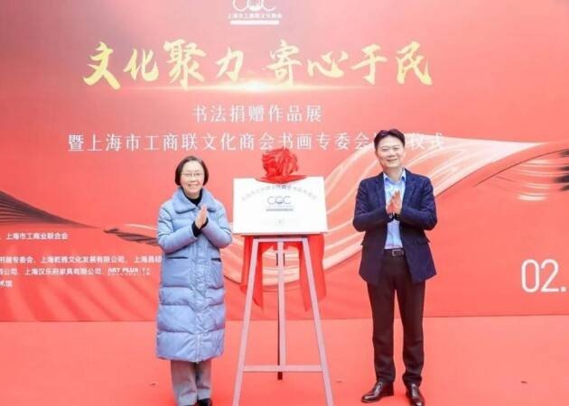 现场,由上海市工商联文化商会书画专委会专委会揭牌仪式,杨茜副主席、杨震华会长为上海市工商联文化商会书画专委会揭牌。