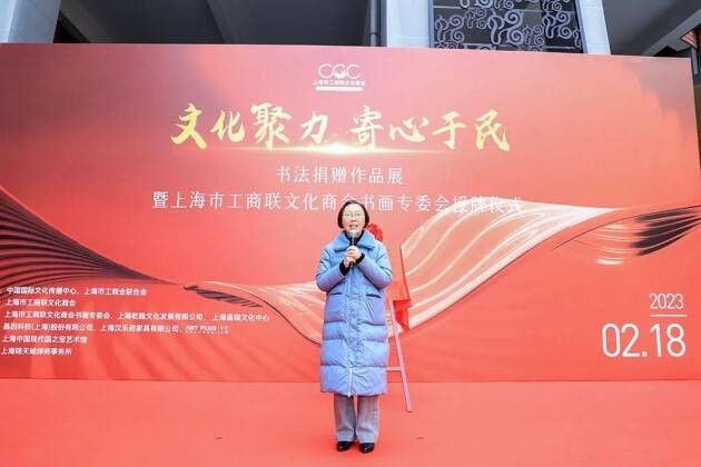 致辞中,在特别感谢德艺双馨的刘小晴、车鹏飞等艺术界大师支持“文化聚力,寄心于民”书法捐赠展之外,特别以其个人理念及经验规划了书画专委会的发展方向。她表示,将从文化振兴、文化赋能、弘扬海派文化、打造企业文化等大方向务实效、做实事,未来书画专委会的宗旨在于文化服务以及文化传承及创新,首先,要真正构建打造好这一文化平台,将书画艺术圈资源融合于工商联企业家之中,真正使“文”与“商”形成有机交融,满足企业家的文化需求,助推企业文化的发展,使平台成为独树一帜、企业家文化之家。再则,以举办传统文化主题:如新年祝福、艺术联欢、青少年传承教育等活动,融合充实这一平台的文化内质,将文化艺术培训教育铺展于企业家圈中,包括工商联会员及子女的文化教育活动,创造工商联新型的文化氛围。书画专委会同时会加强横向社团机构及区域文化交流合作,“引进来,走出去”,扩展企业的文化交流渠道及机会,发展地区特色文化。