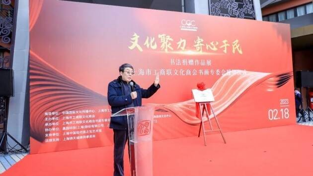 在“文化聚力,寄心于民”书法捐赠作品展暨上海市工商联文化商会书画专委会授牌仪式上,首先由中国国际文化传播中心执行主席龙宇翔先生特别为本次活动发表视频致辞。龙主席在致辞中说,“文化聚力寄心于民”书法捐赠作品展,用书法献礼,以笔墨传情,在书法文化发展的基石上,以民族文化、馨香传承、凝聚大爱、谱写情怀,将中华民族优秀传统文化化为凝聚人心、回馈人民的正能量,这是将植根人民生活的民族文化,以笔墨丹青的形式真切回馈于民,真切担起传递新时代文化价值的使命与责任。