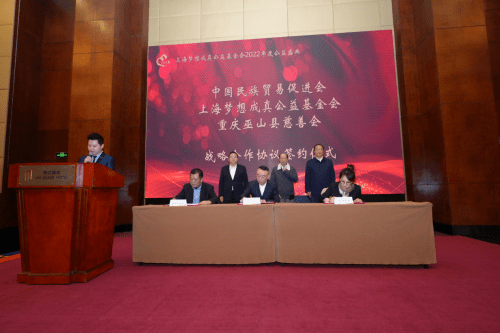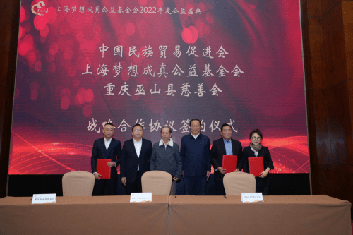 2023年2月25日,中国民族贸易促进会、上海梦想成真公益基金会、重庆市巫山县慈善总会在上海签署战略合作协议,三方将在扶贫济困、教育助学、医疗救助等多领域开展公益合作和定期交流,建立长期、稳定、紧密的战略合作关系。