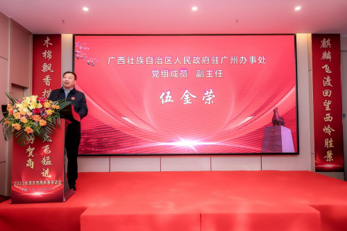 广西壮族自治区人民政府驻广州办事处党组成员、副主任伍金荣致辞。伍金荣首先肯定了广东省富川商会在各方面工作取得的优异成绩,他强调,2023年是全面贯彻落实党的二十大精神的开局之年,今年的自治区政府工作报告也明确提出了“推进贺州建设东融先行示范区”的目标。