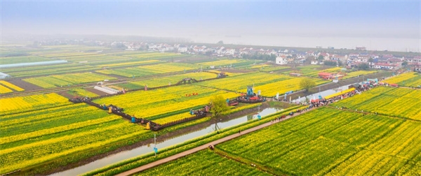 面朝长江,春暖花香。位于长江中游南岸的临湘市江南镇长江村,万亩油菜花正迎春绽放,微风拂过,如金浪逐沙,前来踏青赏花的游客赏金黄花海,品临湘砖茶、逛乡村集市、尝江南美食,欢声笑语感受春日浪漫,田园、花海、村落、游人,构成了一幅浑然天成的美丽田园画卷,惹人陶醉。3月8日上午,2023年岳阳国际旅游节暨第五届江南油菜花节在临湘市江南镇长江村盛大开启,3万名嘉宾游客迎着春光,相约江南,共赏万亩花海。