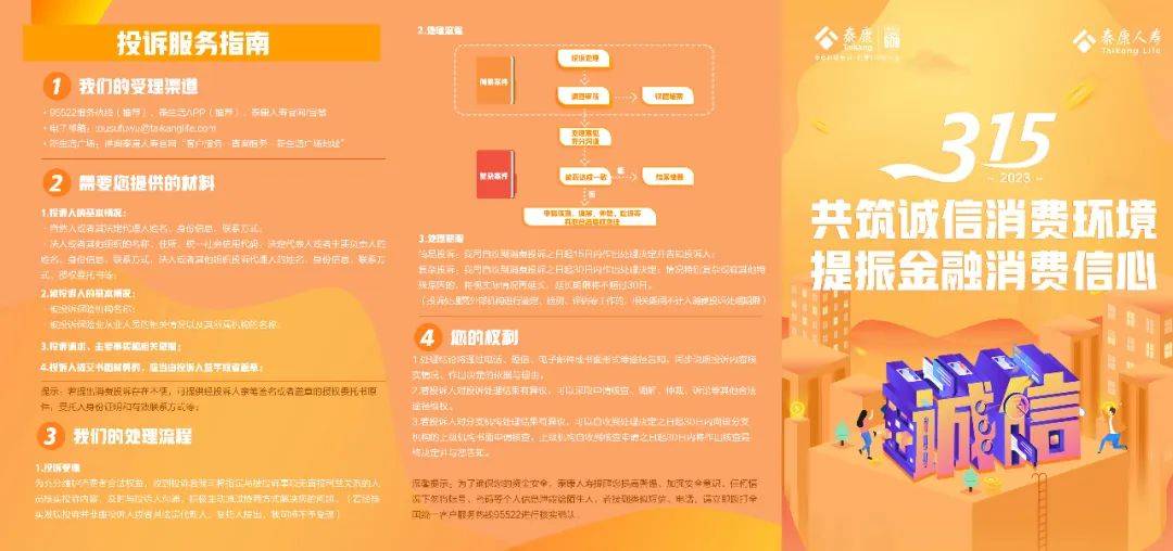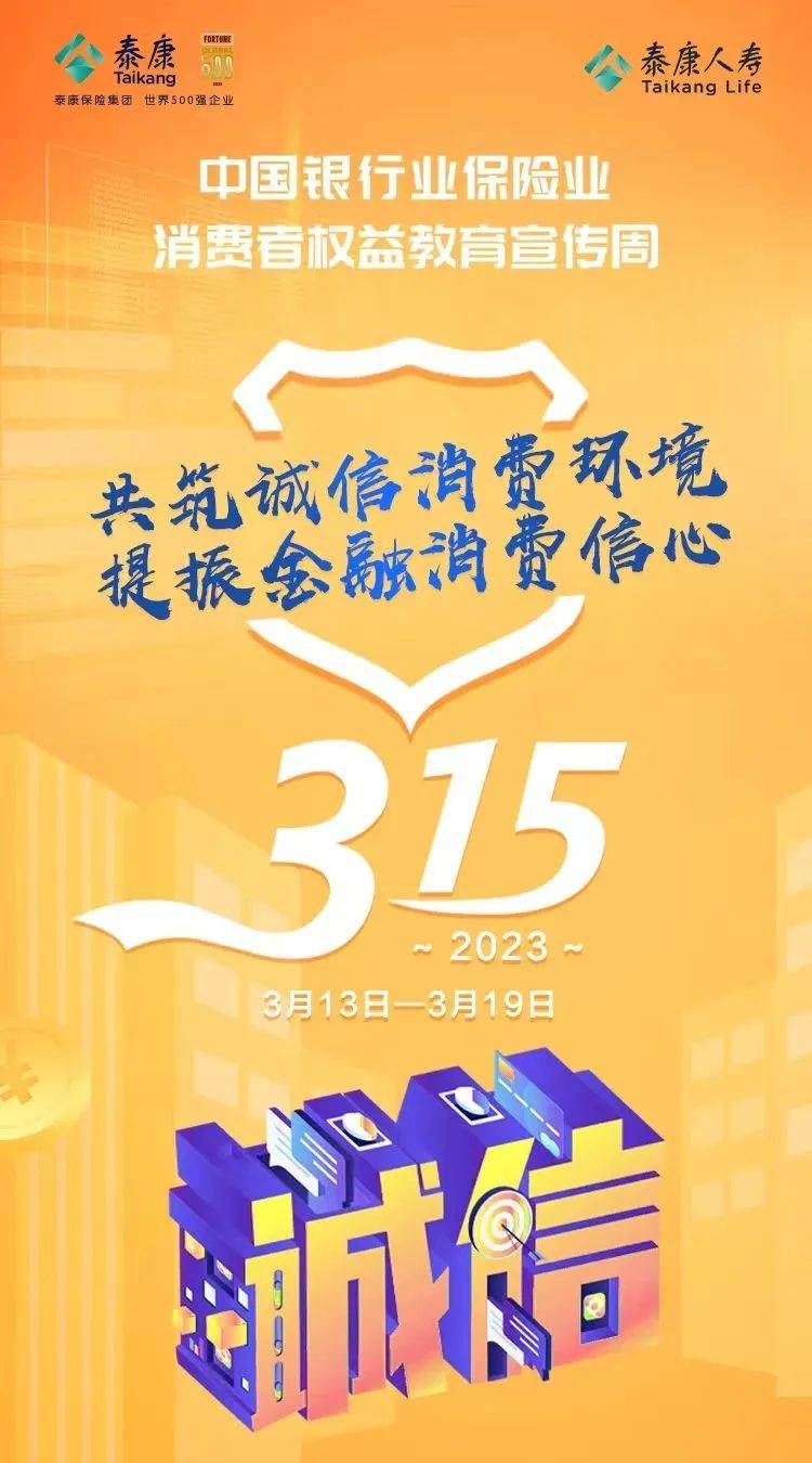 3月13日开始,泰康人寿积极响应、落实监管要求,围绕“共筑诚信消费环境 提振金融消费信心”主题,在全国各分支机构开展“3.15”消费者权益保护教育宣传周系列活动。