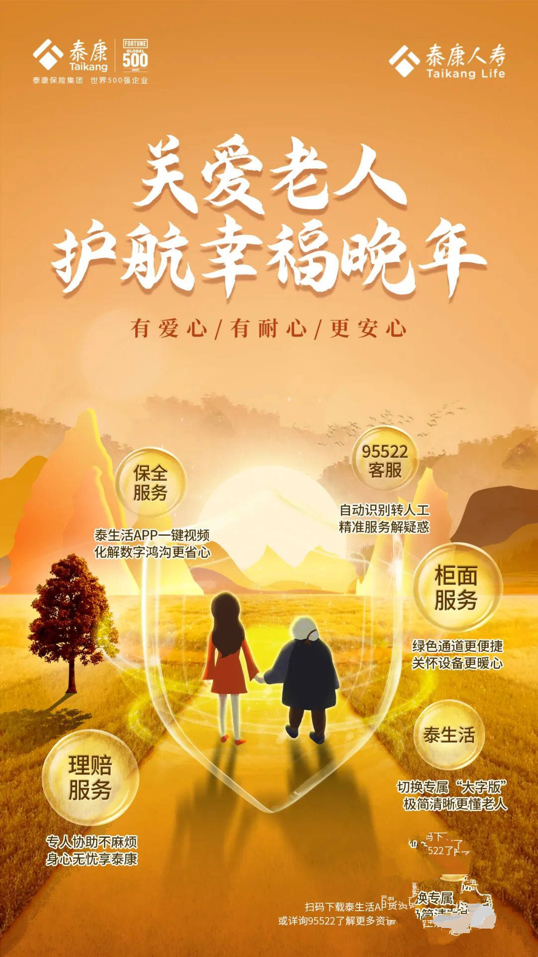 同时,泰康人寿还特别关注线上服务适老化改造,帮助老年人群体解決数字鸿沟问题。泰生活APP“关怀版”新增“一键求助”功能,为年龄60周岁以上老年人提供一键呼叫95522客服热线服务。此外,针对理赔服务,泰生活APP“关怀版”进行三项改造。适老化首页新增“理赔服务”图标,让老年客户更快捷使用理赔服务功能;新增自动语音播报功能,AI相机提示语自动语音播报;点选语音播报功能(原理赔报案、理赔申请文字引导部分新增语音播放图标,点击图标可进行理赔语音指引)减少老年用户阅读成本。