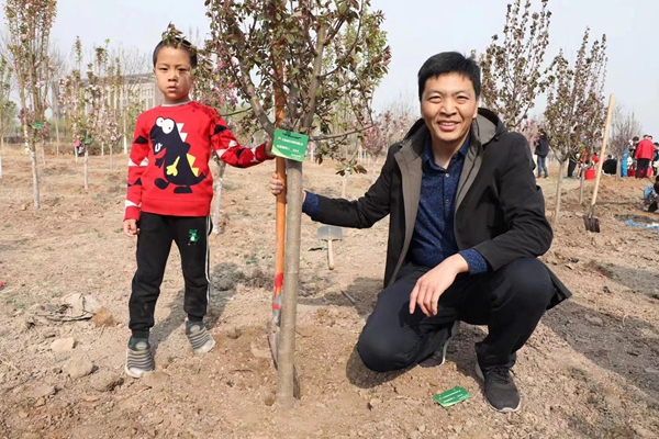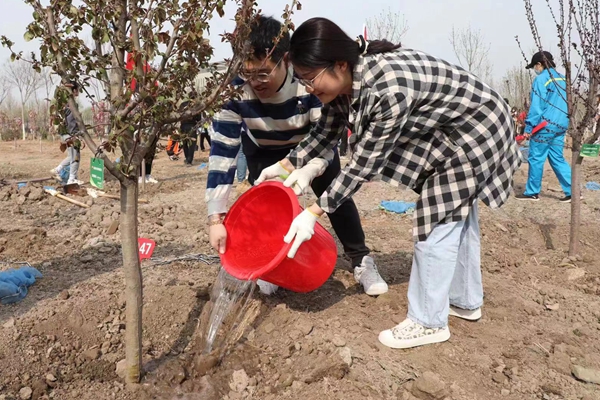 春风不迟如约至,植树添绿正当时。我院30余名职工及家属分工合作,三个一群、五个一组,不停地挥锹铲土、培实新土、堆起围堰、扶树浇灌,每一个步骤都一丝不苟,每一个环节都毫不含糊,汗水顺着脸颊涔涔流下,热情和干劲却没有停歇。经过一番热火朝天的劳动,45棵海棠树迎风矗立,将这里的装点的生机盎然!种植后,大家将认领的专属名牌小心翼翼的挂在树上,并纷纷和亲手种植的小树合影留念。