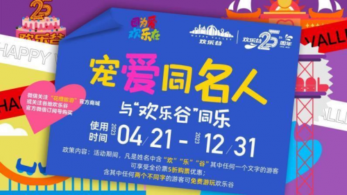 二是宠爱同名人-与“欢乐谷”同乐:从4月21日到年底,凡是姓名中含“欢”“乐”“谷”其中任何一个文字的游客,可享受成人票5折购票优惠;含其中任何两个不同字的游客可免费游玩欢乐谷;