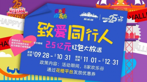 三是致爱同行人-2.5亿元红包大放送:发放日期从9月28日到10月31日,而使用日期则是从11月1日-12月31日。在活动期间,8家欢乐谷会通过花橙平台发放不同面值的优惠券。这也是主题公园史上力度罕见的重磅回馈。