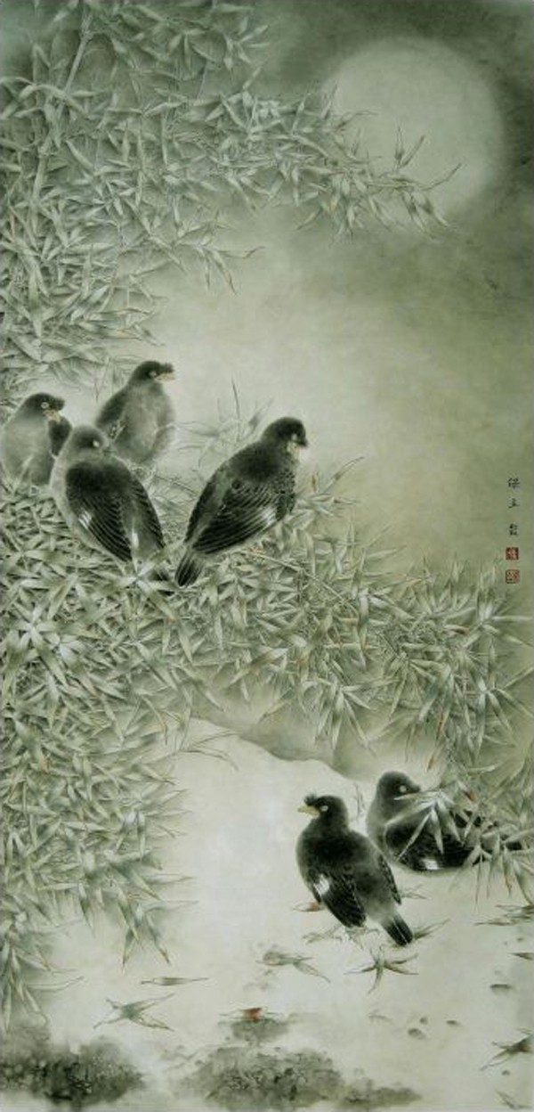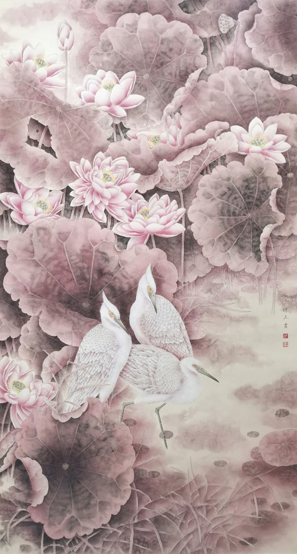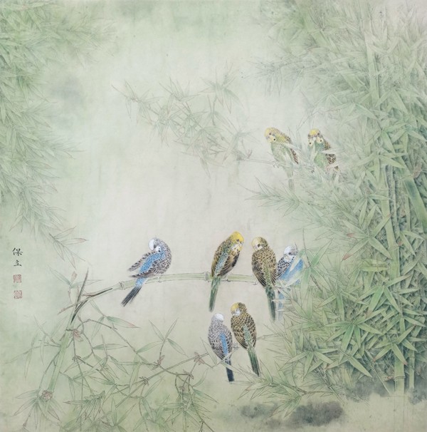 高雅的赋色表现可以说是创作工笔花鸟的一个重要关键点所在!但不是任何一位工笔画家都能掌握好赋色的分寸,倘若赋色过于浓艳,画面则就会显得无比庸俗,而倘若赋色过于浅淡,画面则又会显得十分羸弱无力。因此一幅出众的工笔花鸟作品,就必然是要在精妙线条的构形基础上展现出那丰富且自然的赋色意识。而今日的陈保立先生创作工笔花鸟作品,显然也就是有达到了这样一种色韵自然的雅逸感!像荷花、风竹、秋柿、牡丹等诸多传统的花卉题材可谓均是有呈现于华润之妙,赋色之际,亦是明艳而不流俗,细腻而不单调,再搭配以生动传神的鸟禽活物,整幅工笔画作即更是可彰显出那大美于情的文人画韵!清雅妍净,画风荡漾,怡情之作,可沁人心!