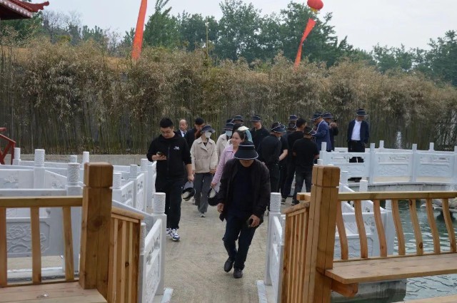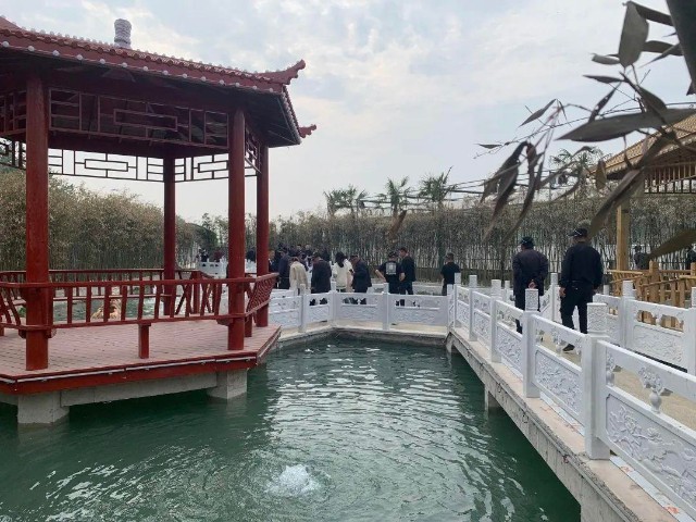 竹林鱼塘的桥上游客们兴趣盎然的讨论着,水中的鱼、池边的竹林及脚下踩的金灿灿的钱币。