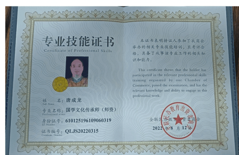 唐成龙:西安市人,易名:太神真人;道号:诚谦。1961年9月出生于终南山畔,1980年11月入伍,在部队服役十五年,十五年的军营生活造就了他契而不舍,奋发向上,拼搏进取的顽强精神。1987年至今他对周易文化学习的兴趣越发浓烈,30多年的实践经验与成功案例积累了自己独到的认识和见解,获得的证书和荣誉是对他学习周易的最好诠释。