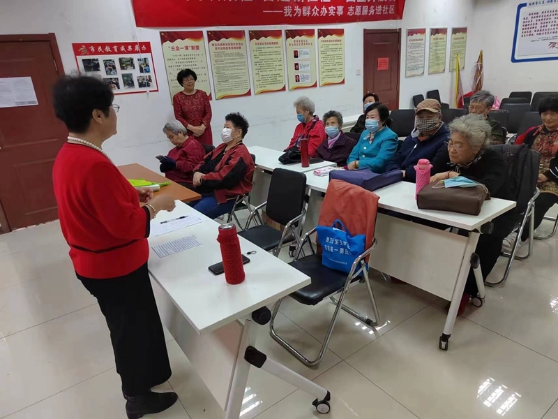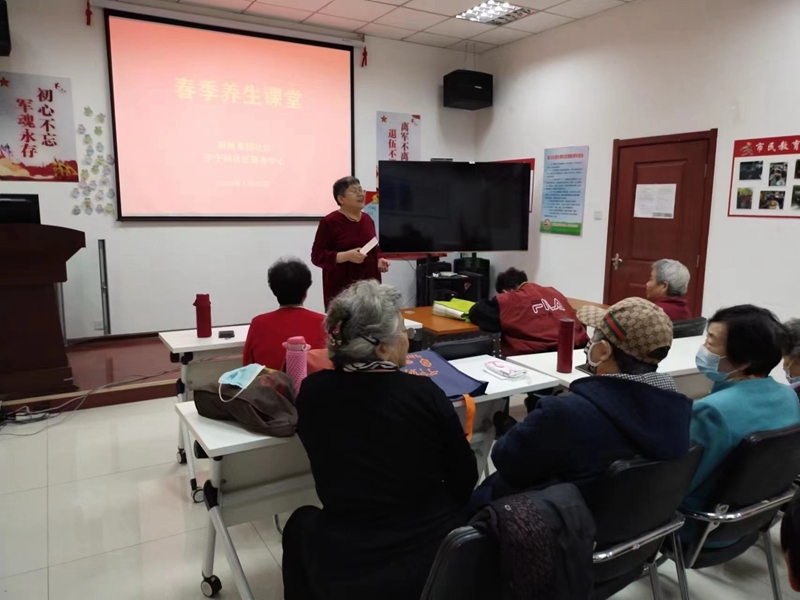 4月27日,在滨海新区新城家园居委会的活动室里,一群来自社区的老年人相聚在一起,共同在这个万物复苏的日子里学习一些老年养生知识。