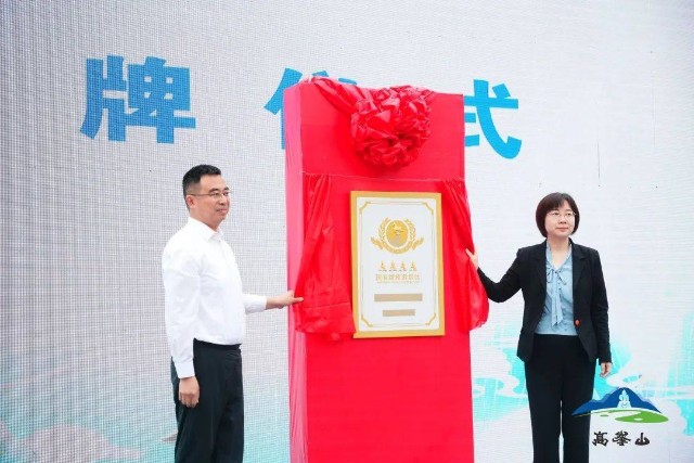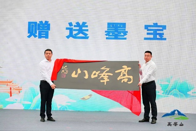 市文化广电旅游局党组成员、副局长张黎、县人大主任文勇为高峰山国家AAAA 级旅游景区揭牌,国书法家协会名誉主席沈鹏发来贺电并为高峰山景区成功建成国家AAAA级旅游景区题赠墨宝。