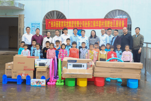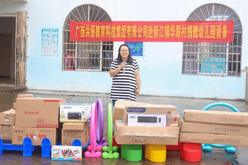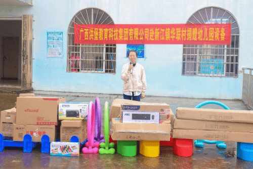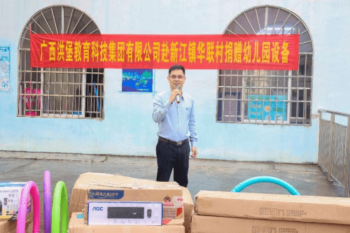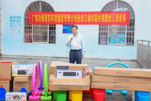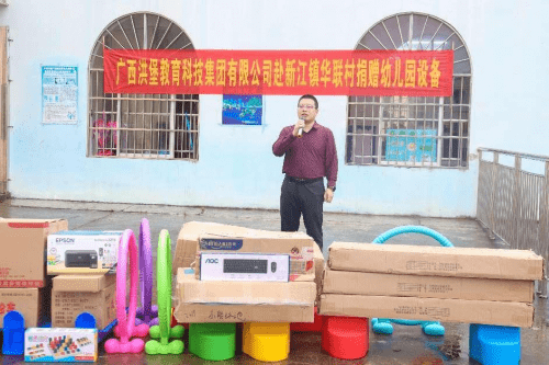 梁世兆校长在致辞中说道:华联小学附属幼儿园的设备一直较差, 只有零零散散的一些玩具,没有电脑、打印机等教学配备,正在为怎样让孩子们能更好的享受到高质量的教育而忧愁,也为申请通过普及普惠幼儿园评估验收缺少多种设备而焦虑。就在今天,广西洪堡科技集团有限公司为我校送来了玩具、书架、打印机、电脑等等,这犹如雪中送炭,解了我们的燃眉之急。这也是对华联村教育事业的大力支持,更是对华联小学附属幼儿园全体师生的关怀和激励。在此,感谢广西洪堡科技集团有限公司的捐赠,感谢黎总经理,感谢林忠伟教授及林忠伟咨政工作室、广西经贸职业技术学院智慧商务产业学院赵院长牵线搭桥,感谢每一位爱心人士,谢谢你们,谢谢你们的善举!我们的感谢唯有把你们的爱心铭记于心,化为工作和学习的动力源泉。你们的捐赠义举必将产生巨大的精神鼓舞,同时也激励我们以更加饱满的热情投入到发展教育的事业中去。希望同学们珍惜这来之不易的机会,常怀感恩之心、常存进取之志,勤奋学习、艰苦奋斗,打下坚实的基础,以优异的成绩来回报社会、回报关爱你们的人,努力成为对社会有用的人才。希望老师们以高度重视负责的态度,继续发扬兢兢业业、无私奉献的精神,勤奋工作,为培养和造就一代栋梁之才,做出更大贡献,使广西洪堡科技集团有限公司的爱心永远驻扎在我们心灵的港湾。