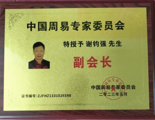 学术方面.谢钧强老师从不自满,坚持学到老做到老,在堪舆易测方面造福于民,服务社会。2018年2月获得河源市周易文化研究会优秀会员称号;2019年10月任北京华夏术数国学文化中心河源市分中心副主任。2019年11月任河源市周易研究会连平分会副会长;2020年9月获得“香港乾坤国学院”高级风水师职称证书。2020年9月被授予“中华周易国学高峰论坛副秘书长”职务;2020年11月被中国新时代行业专家人才数据库行业专家委员会授予“国学行业影响力人物”;2021年4月被中国新时代行业专家人才数据库国学行业专家委员会聘请为《资深首席顾问》。