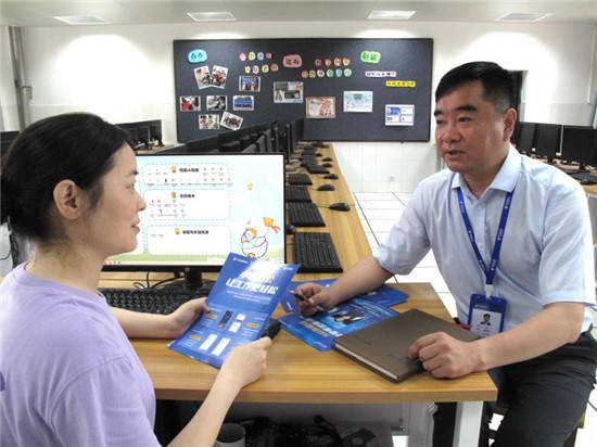 图为田朝到小学走访了解机房搬迁情况,并向学校信息中心主任介绍新业务