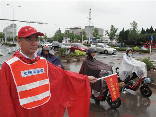图为近日,田朝冒雨参加志愿者文明交通执勤