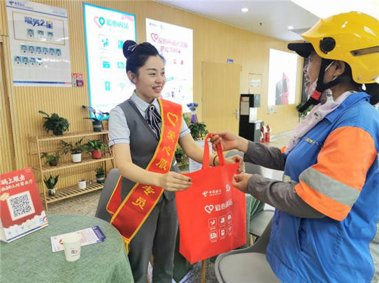 连日来高温持续不下,中国电信淮安分公司水渡广场营业厅爱心翼站,为户外工作者提供纳凉休息、饮水、手机应用辅导、充电、反诈骗知识宣传等服务,为户外工作者送上一份清凉、一份爱心,让这些酷暑中坚守一线的辛勤劳动者真切感受到来自电信人的关怀。图为7月13日, 爱心服务专员为环卫工人送上爱心翼站防署降温礼包。