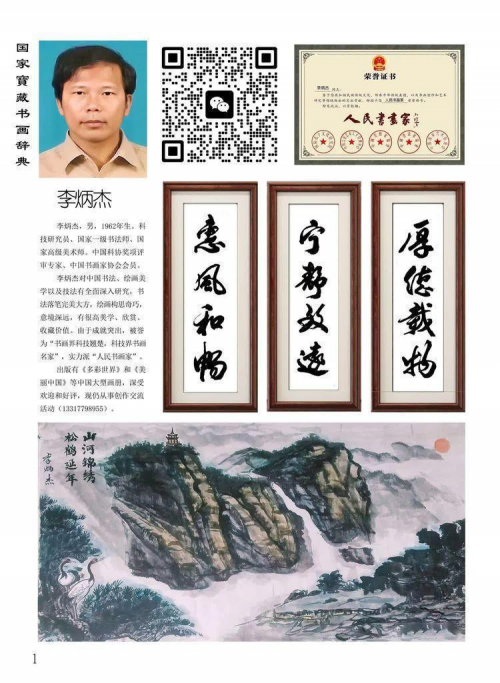 李炳杰,科技研究员、国家一级书法师、国家高级美术师职称。中国科协奖项评审专家、中国书画家协会会员。