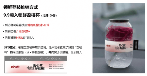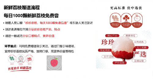 最终在经过多轮的头脑风暴后,制定了一个果饮快销品比较新奇的推广形式——“荔枝鲜果试吃与调饮”让珍友亲自检验珍珍荔枝的品质。于是一颗颗珍珍鲜果每天坐着飞机从广东飞到东北来跟珍友见面,让珍友品尝珍珍的荔枝鲜果,从原料放大珍珍的纯度认知,自源头发掘荔枝与珍珍的关系。