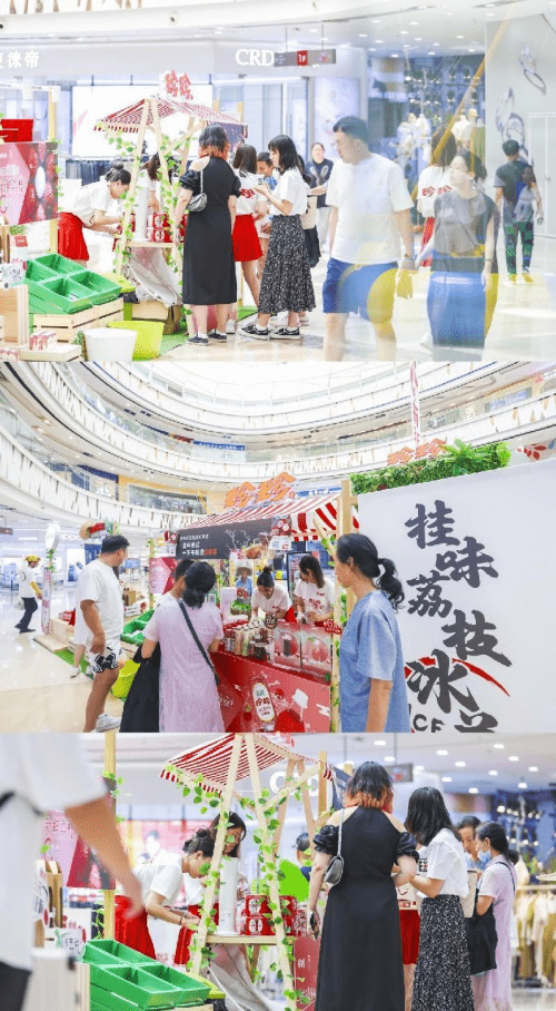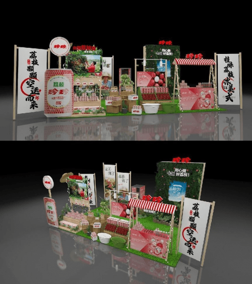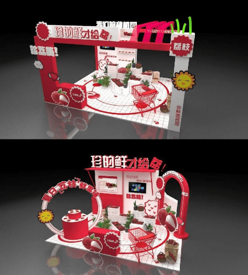 索性大胆尝试,从原材料出发,以荔枝生长环境为参考,还原果农丰收的热闹场景,不仅主题独特,更能让消费者在参与的同时感受来自远方珍珍鲜果产地的亲切,同时,在实景展现上,拿捏设计细节,百分之百将场景呈现。
