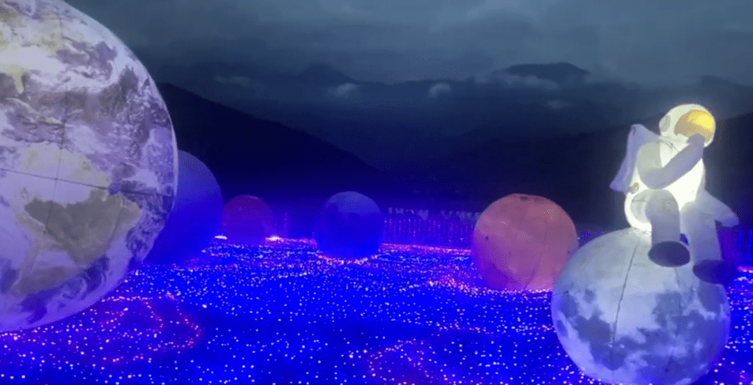 数颗行星悬浮闪烁着星灯,犹如置身于一片璀璨的银河系,美的一发不可收拾!为游客带来遨游太空的浪漫体验!