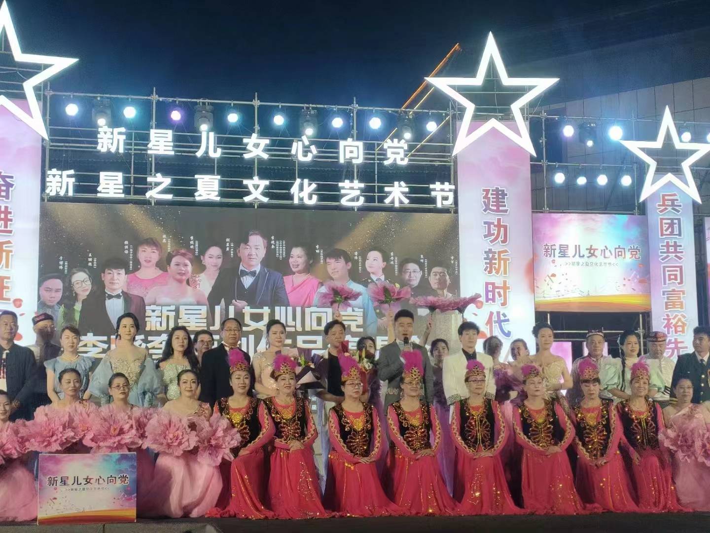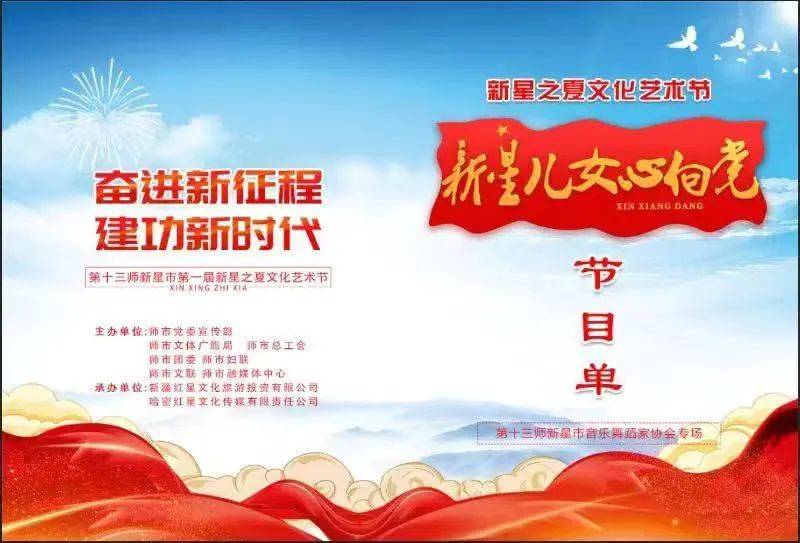 师市第一届“新星儿女心向党”新星之夏文化艺术节活动由师市党委宣传部,师市文体广旅局、总工会、团委、妇联、文联,师融媒体中心联合主办,第十三师新星市音乐舞蹈家协会、新疆红星文化旅游投资有限公司、哈密红星文化传媒有限责任公司承办。