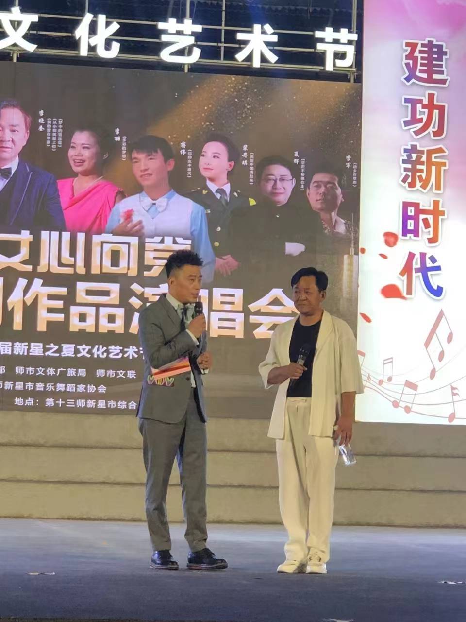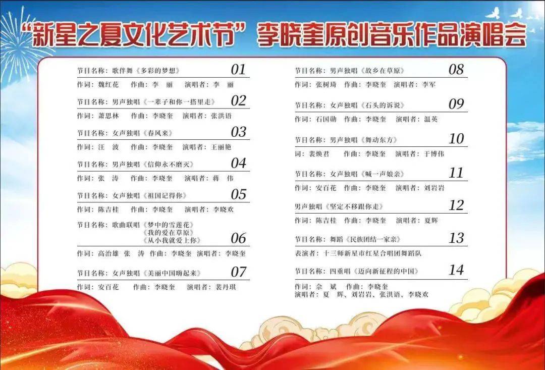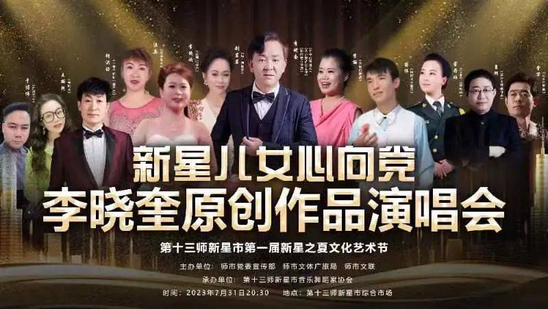 师市第一届 “新星儿女心向党”新星之夏文化艺术节火热进行中,2023年7月31日,李晓奎原创作品演唱会在新星市综合市场顺利开演。第十三师新星市党委常委、第十三师副政委、党委宣传部部长、党委统战部部长、政协新星市委员会党组书记、主席潘朝印,第十三师新星市党委宣传部常务副部长张生、第十三师新星市文学艺术界联合会副主席冯斌圣等师市领导观看了此次演出。