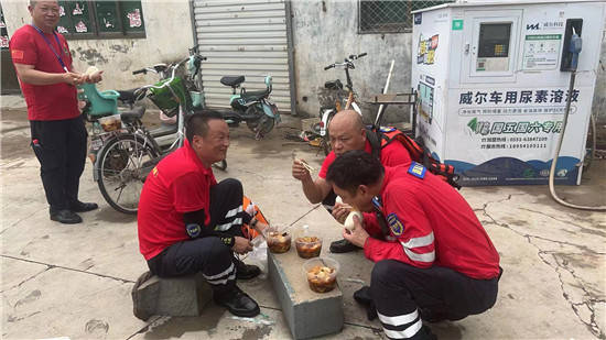 天蒙蒙亮,队员们已经全身湿透稍作调整继续救援赶往灾区一线(107-桃园办事处,玉田,庞田庄,大马村等)进行救援,当时因为不熟悉路况直接一辆救援车被水淹了。这样更加加大了救援难度,队员们决定弃车徒步前行,当时当地向导都特别感动!简单吃了点干吃面火腿肠后继续前往受灾区!进入一线后,当时情况非常复杂来自全国各地的救援力量都在紧张救援。队员们二话没说直接进入救援状态“灾情就是命令,分秒必争”一个字“怼”。