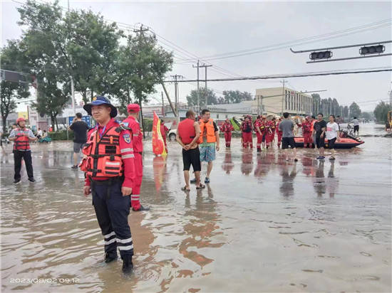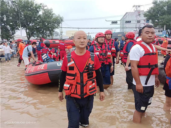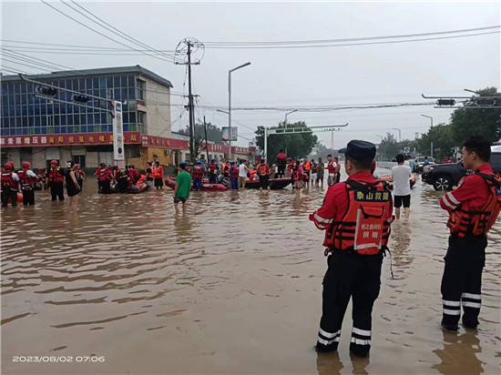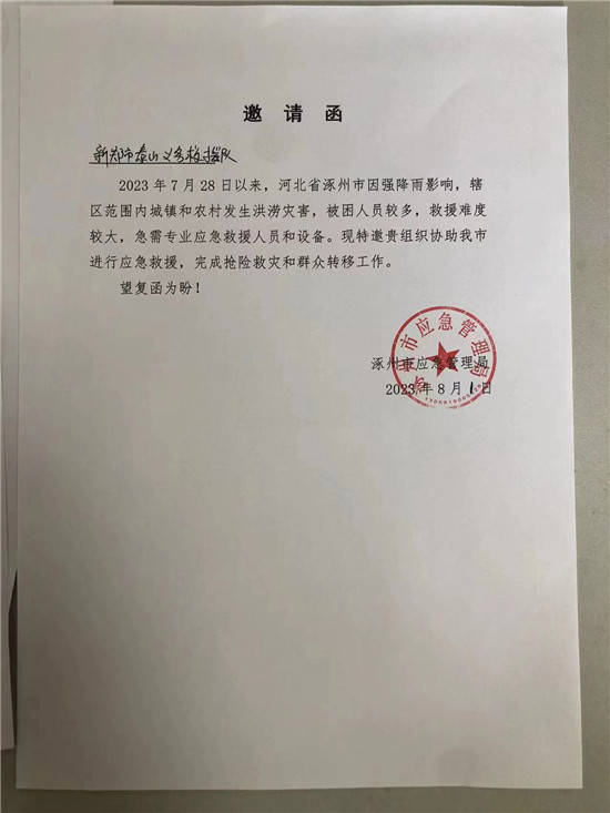2023年8月2日上午11点全员轮流休息轮流开船进入灾区救援群众,由于对当地路况不熟悉,当时直接报废船只马达一台!让救援又一次陷入了困境。为了不耽误救援,决定把水淹的车送回河南,顺便从河南队部再次调配船只,装备让队员送到涿州,当时凌晨2点第二梯队船只在涿州当地政府指引下顺利到达一线。天亮后继续救援工作,截止到2023年8月4日下午16.45完成任务最后的转移在志愿者引导下来到涿州天外天(抗洪救灾指挥部)等待新的任务,下午17.50接到涿州市临时指挥部通知所有救援队有序撤出,感谢大家付出的一切!大家开始准备回河南的事宜,跟涿州应急局做了最后对接,并开“市局邀请函”离开涿州的证明!2023年8月4日由新郑市新郑市龙湖镇泰山救援队,龙湖镇政府领导的同意下12人组成临时救援突击队圆满完成任务,在涿州人民的热情欢送中平安在涿州高速顺利踏上归途