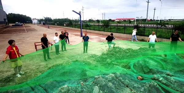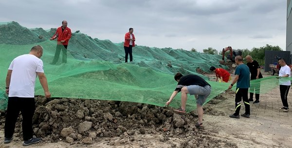 活动中,根据人员年龄特点,大家分工协作,年轻人冲锋在前,爬到土堆高处进行苫盖,年龄大的站在低处协助,苫盖过程中,大家用石块对防尘网周边压紧压实,再用铁丝在防尘网中间连接处扎紧扎实,确保苫盖到位。在清理散落土现场,支部党员率先垂范,用实际行动带动大量群众纷纷参与其中。“有多的铁锹吗?我也来帮个忙!”群众们争先恐后地拿起铁锹和扫帚对散落土和地面进行仔细清理。经过大家的共同努力,仅用时两小时,就将裸露施工土全部苫盖,地面散土全部清理。苫盖绿网后的区域如同一片绿色植被,清理后的地面整洁如新,院区环境又恢复了以往的美丽。