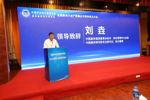 刘垚在致辞中表示:中国健康养老集团作为共同体牵头组建单位之一,将充分发挥自身在健康养老行业的引领示范作用,服务积极应对人口老龄化国家战略,在产教融合中积极作为,协同本科院校、职业学校为共同体的高质量发展贡献力量。