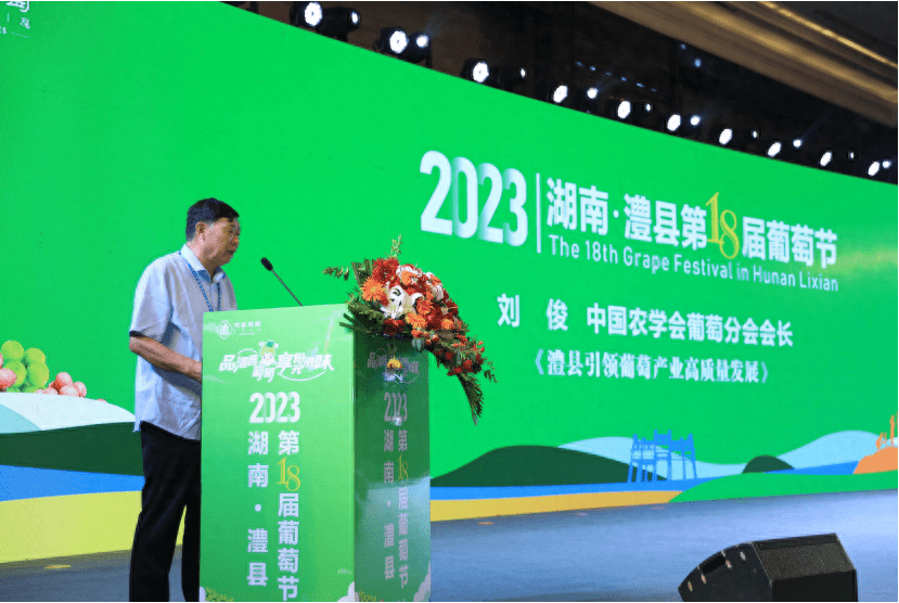 中国农学会葡萄分会会长刘俊现场发表了《澧县引领葡萄产业高质量发展》主题演讲。他在报告中指出,2022年全县葡萄种植面积6.7万亩(其中阳光玫瑰5万亩),总产15万吨,产值超30亿元,2023年葡萄全产业链产值预计可超40亿元,被业内誉为“南方的吐鲁番”;葡萄产业已成为澧县农民增收、农业增效的重要产业。中国农学会葡萄分会与澧县合作联系密切,先后承办了中国农学会葡萄分会全国性专题学术研讨会、先后挂牌成立建设中国农学会葡萄分会澧县工作站,中国阳光玫瑰标准化栽培示范县等。澧县的成功做法,为乡村振兴提供了新途径,为产业兴旺提供了新样板,为全国乡村振兴农业产业发展提供了典型经验。