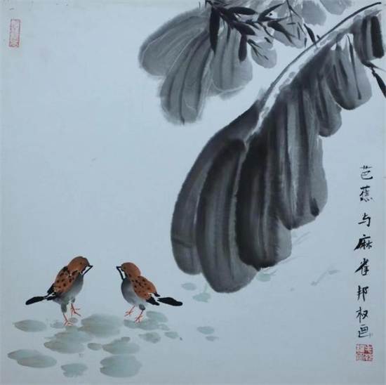 走上绘画艺术之路的第一站,毛邦权被水墨交错,写意精妙的中国画所吸引,幼小的孩童凭借着一腔热爱与毅力,无论严寒酷暑,始终坚持恩师的嘱咐,“日日画,日日思,日日精。”而他笔下的艺术世界也初见端倪,年仅12岁的毛邦权便举办了自己的国画习作展,一副水墨《芭蕉与麻雀》以灵动细腻的笔触,颇具意趣的线条,生动的定格了树下雀鸟的憨态可掬,颇有几分“明月别枝惊鹊”的古家风度。