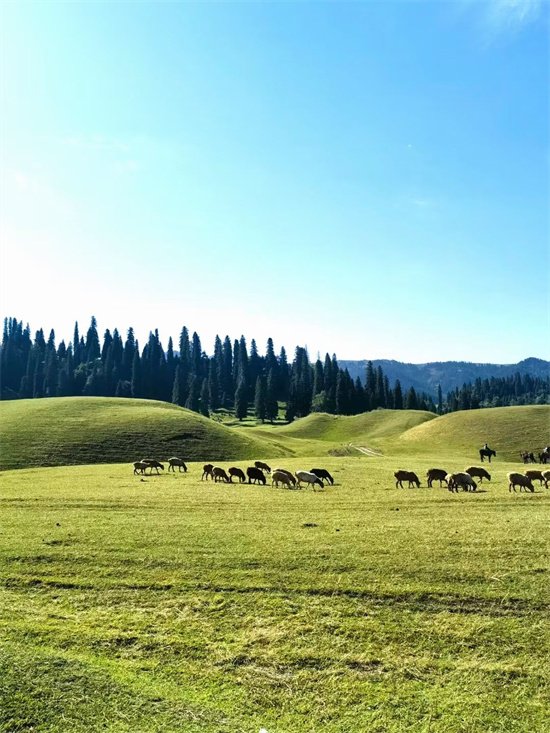 第六天来到了那拉提草原是我国空中草原中的天花板,苍翠的山谷,洁白的云朵,一眼望不到头的草地,成群的牛羊,奔腾的骏马,构成了一幅独一无二的属于那拉提的美丽画卷。那拉提草原不负时光,与之牛羊一起共舞、净化心灵。从中可以看到一大群牛羊悠然自得的吃着草,慢悠悠的走过来散步。突看到一只大牛走在小路上,下坡小溪处俯下身开怀畅饮的喝水,喝饱后离开,那晃头晃脑的样子可爱极了。感悟到生命最有趣的部分,正是它没有剧本、没有彩排、不能重来。生命最有分量的部分,正是要做自己。