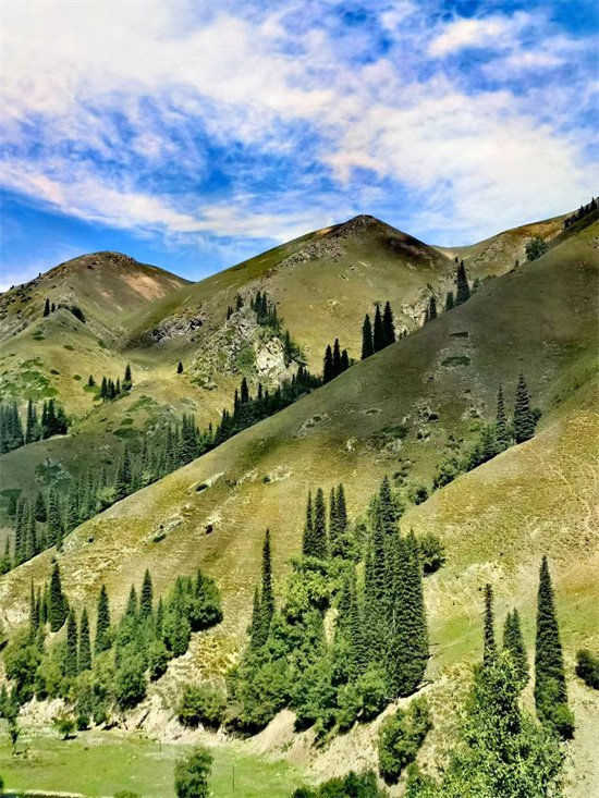 第四天来到了喀拉峻草原,千里草原是其最具代表性的景观,一草原上分布着大量的野生动物和植物,五彩斑斓的花朵点缀期间的白色毡房,墨绿的原始森林,深邃的大峡谷配以天际的蓝天白云构成一幅美丽绝伦的画卷,给人们带来了极为美妙的自然体验。当我们骑在马上仰望天空时,会想到五个字:“那都不是事”。所有的格局胸怀在一瞬间被打开,感受到生命是如此的美好,人最宝贵的是生命,生命属于人只有一次,一个人生命应该是这样度过的,当回首往事的时候,不会因虚度年华而悔恨,也不会因碌碌无为而羞耻。