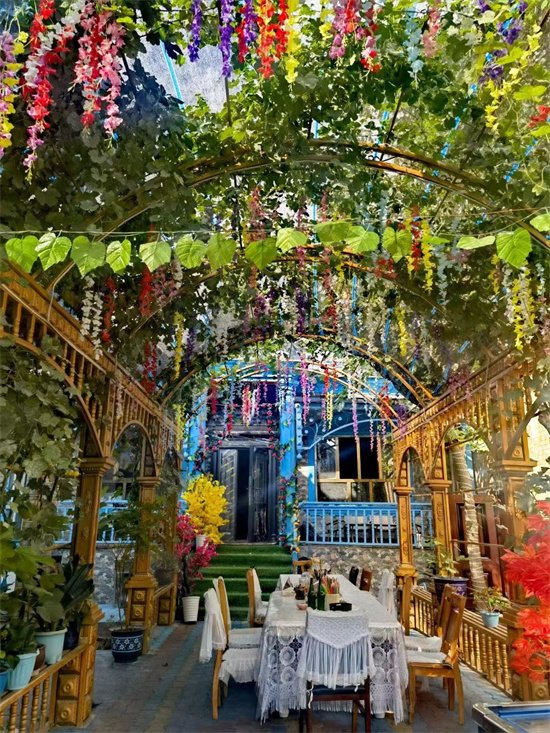 第三天来到了伊犁老城喀赞其,百年喀赞其是感受古丝绸之路文化,了解中西亚历史相融风情的重要窗口。还在于他的古老建筑和林林总总的老字号带来的历史价值,更在于一代代人生生不息的人文情怀和文化韵味。整个老城都是蓝色屋墙,游走其间,就像是走进了童话世界。漫步喀赞其民俗旅游区,抬眼即见蓝色门窗、蓝色的屋墙,这里至今依旧保留着原汁原味的维吾尔族传统生活方式。古色古香的维吾尔族民居,每家每户的花园装饰诗情画意,这里的人们脸上都挂着幸福的笑容。随处可见挺拔朴实的白杨,以及硕果累累的桑葚树。街巷里的冰淇淋店价廉物美、还有醇香的奶茶味飘满整个大街,让大家领略到不同地方的文化风情。感悟到知足才能常乐,常乐才能知足。天那么大,不可能全部拥有,有自己的一片天空就好。人那么多,不可能全部相识,有自己的一群朋友就好。长长的路,我们慢慢的走,相信最好的人,最美的风景,一直在路上。