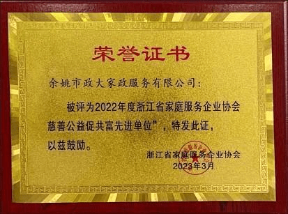 公司成立后,经营硕果累累,屡获殊荣,经过多年发展,形成了特有的企业文化,在经营方式上充分体现公益性和服务性,采取“让天下没有难做的家政”的企业使命,使企业在竞争激烈的市场中脱颖而出,各项业务稳步推进,在行业内有明显的示范带动作用。先后被评为2020-2022年度浙江省家庭服务企业协会慈善公益促共富先进单位、省级家服助推未来社区先进单位,宁波大数据发展协会会员单位,余姚市第十二大科学技术协会代表,余姚市工商联工坊共富定点单位、余姚市家庭服务行业协会副会长单位、余姚市家庭服务行业协会同城物(搬家)专业委员会等等荣誉。