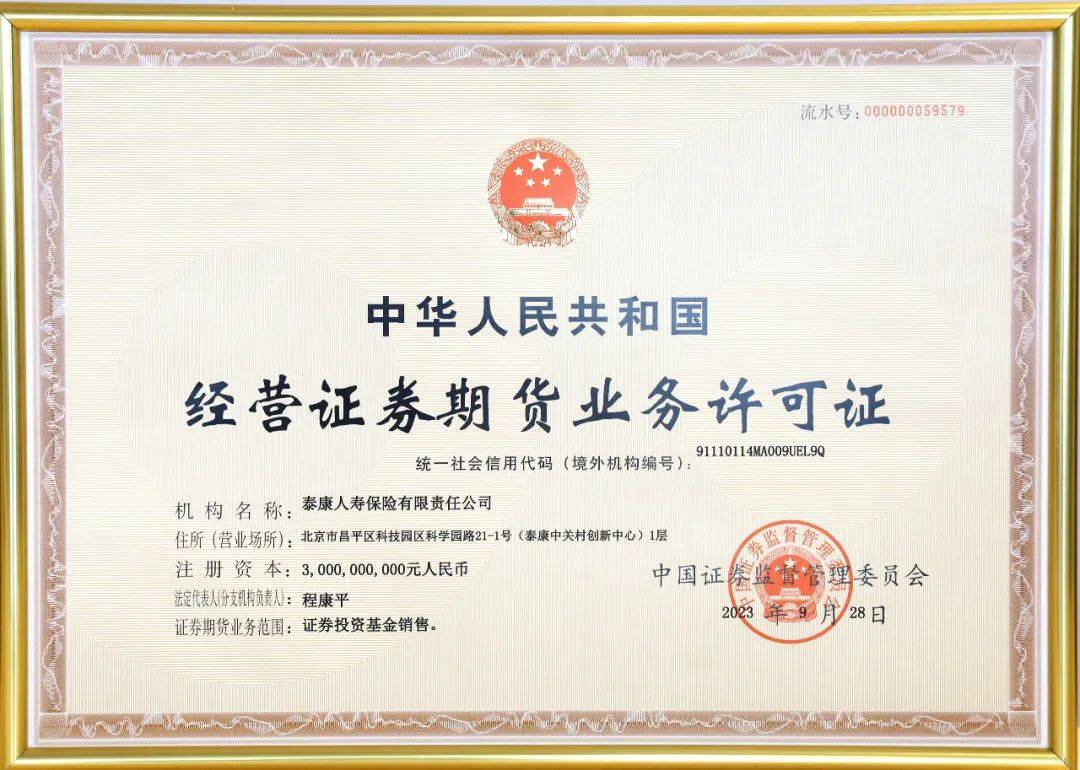 泰康人寿保险有限责任公司于2023年9月28日取得中国证券监督管理委员会核发的《经营证券期货业务许可证》。此前,泰康人寿于今年3月22日获得中国证监会北京监管局发布的行政许可,核准泰康人寿证券投资基金销售业务资格。至此,泰康人寿财富闭环布局建设再落一子,证券投资基金销售扬帆起航,为日益增长的中高净值人群及其家庭打造长寿、健康、财富的一体化服务平台。