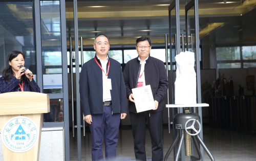 今天我们还有一个特别的环节,今年正值安徽建筑大学建校65周年,安徽建筑大学95级环境艺术设计专业校友、淮北市刘开渠纪念馆馆长、安徽省雕塑协会副会长刘开辉先生创作的汉白玉雕塑作品《蜕变》为安徽建筑大学65周年献礼(该作品荣获2023中国石雕艺术精品展一等奖),安徽建筑大学党委常委、副校长、教授闵杰为刘开辉颁发作品收藏证书!