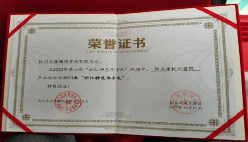 2019年,公司成为浙江省品牌建设联合会发布的《杭州酱鸭》浙江制造团体标准第一起草单位。2022年,公司“新大康”商标录入杭州市市场监督管理局公布的第一批杭州市重点商标保护名录;同年,公司“传统食品腌腊技艺”入选第七批杭州市非物质文化遗产代表性项目名录;2023年10月,新大康参加了在义乌国际博览中心由浙江省消费者保护委员会和浙江省质量协会共同组织召开的“2023年.第四届浙江特色伴手礼发布会”,入选第四届浙江持色伴手礼!新大康酱鸭已第三次获得这项殊荣。