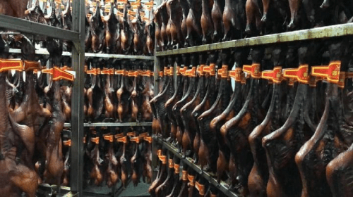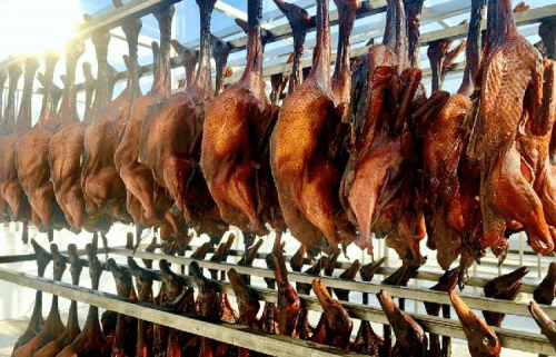 图为成排晾晒中的杭州酱鸭