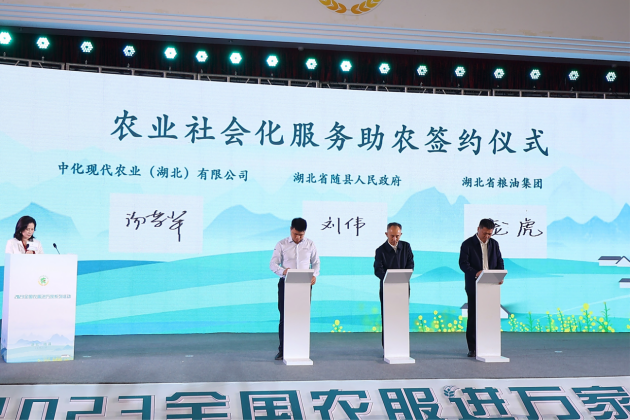 举行了随县农业社会化服务助农签约仪式,湖北省随县县委副书记、县长 刘伟、湖北省粮油集团有限公司党委副书记总经理庞虎、中化现代农业(湖北)有限公司副总经理汤荣辉共同登台签约。