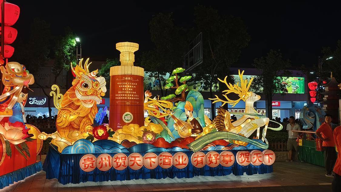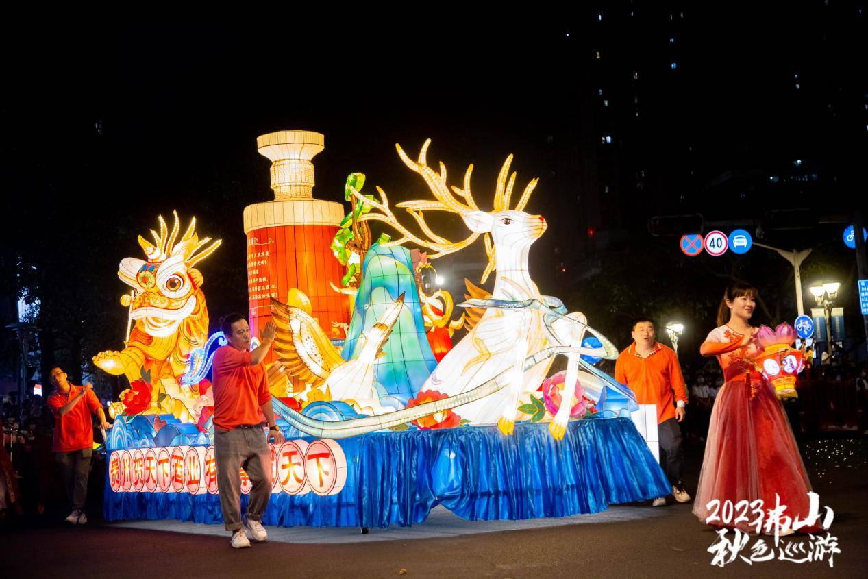 在晚上的秋色巡游环节,贵州贺天下酒业彩车闪耀登场。彩车以贺天下“福缘”酒瓶形象为主体设计,酒瓶设计以中国红主色搭配祥云点缀,以佛山传统扎作工艺为基础,整体以立体造型呈现。头部以寓意健康长寿的福寿三色鹿为设计元素,中部以独奏琴师与飞天仙子营造和平盛世幸福人间的氛围感。整车造型内置发光暖色光源,呈现一派祥和欢腾之意。贺天下酒业一众工作人员穿着统一的工作服,参与到秋色巡游中。沿途市民群众纷纷用手机拍下贺天下酒业巡游彩车。巡游所到之处,汇聚成一片欢乐的海洋。
