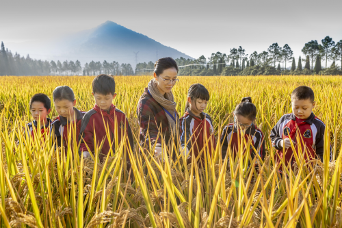 图为杭州市临平区超山小学 顾建文带学生感受稻田教育