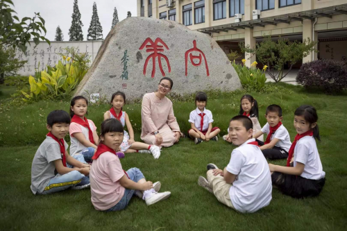 图为 杭州市临平区超山小学 校长顾建文与他的学生合影
