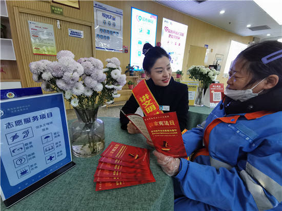 12月4日,中国电信淮安分公司水渡广场营业厅爱心翼站专员向前来休息的环卫工人发放普法宣传资料。当日是我国国家宪法日,爱心翼站专员通过资料发放等多种形式,向客户进行法律宣传,提高群众知法、懂法、守法意识。