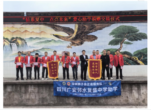 活动中,深圳狮子会正道服务队与复盛中学进行了捐赠交接,卢小峰书记、陈树林镇长、荣维森校长并为他们颁发了奖状和锦旗,并对他们的捐赠善举和对复中教育事业的关心表示由衷的感谢。