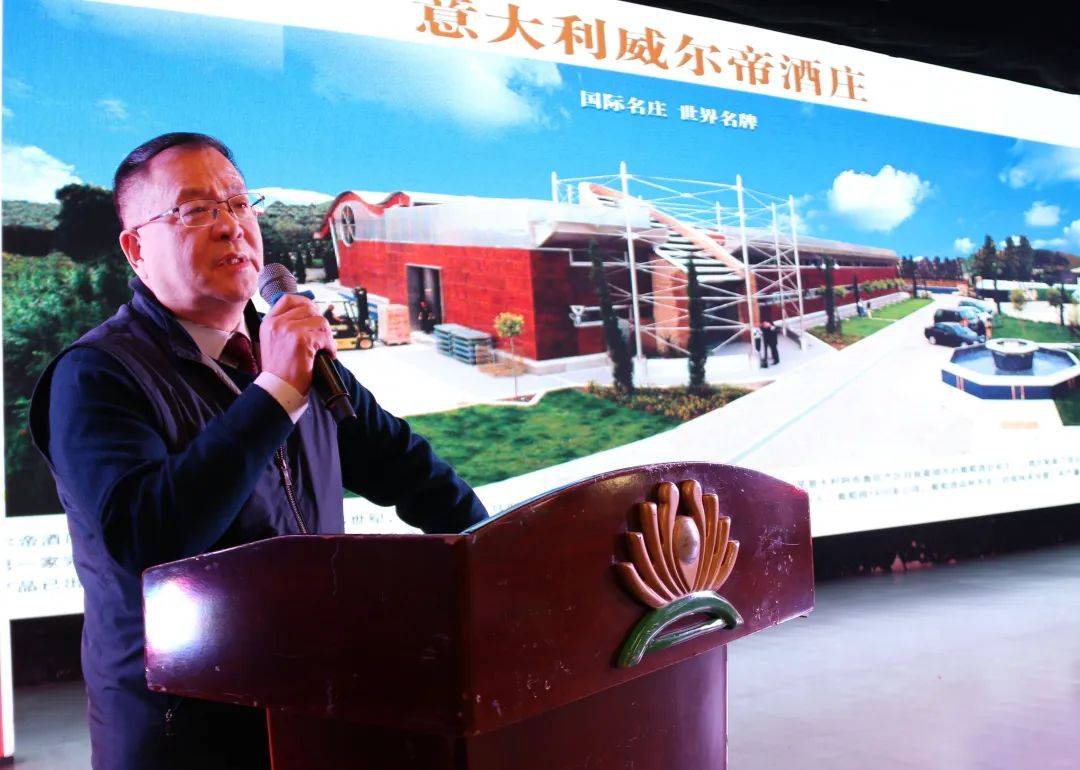 淮安市淮安区振兴发展促进会王金宽副会长代表家乡父老乡亲致辞,对威尔帝国际酒庄新疆总部,新疆醇香酒廊贸易有限责任公司的成立表示热烈的祝贺。